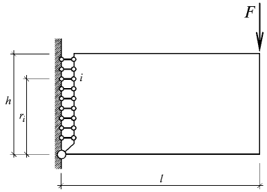 Zjednodušme výše popsanou úlohu zavedením symetrie a předpokládejme, že pro vystižení lomu trámce bude postačovat sledovat přetvoření vláken bezprostředně na ose symetrie (bližší úvahou je zřejmé, že tento předpoklad neplatí, což ale nemusí být na závadu). Jednu ze dvou symetrických polovin trámce nahradíme tuhou deskou připojenou k vetknutí kloubem a množinou vláken, která budou nahrazovat působící materiál, viz obr. 3.