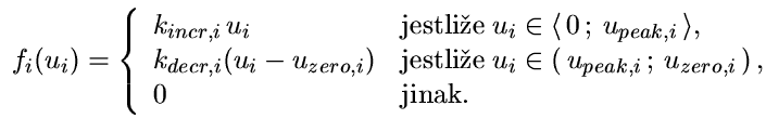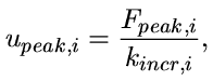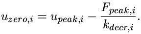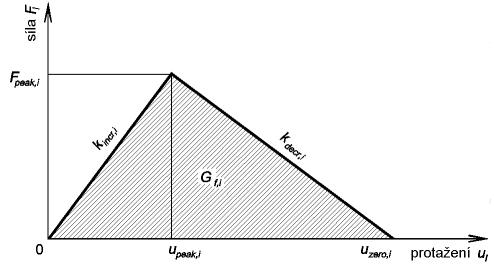 kde kincr,i je tuhost vlákna při pružném působení (což odpovídá sklonu vzestupné části diagramu), kdecr,i odpovídá sklonu sestupné části diagramu, upeak,i je protažení vlákna, při kterém je dosaženo maximální síly ve vláknu a uzero,i je maximální protažení vlákna (překročením této hodnoty dochází k jeho přetržení), viz obr. 4.