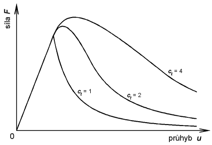 Závěrem si ukažme jak se projeví hodnota specifické lomové energie na odezvě modelu. Na obr. 6 je vidět srovnání diagramů síla - průhyb pro různé hodnoty koeficientu specifické lomové energie ct .