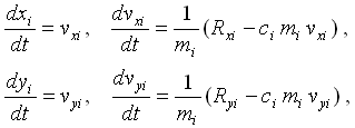 kde xi a yi jsou souřadnice i-tého hmotného bodu, vxi, vyi jsou složky aktuální rychlosti, Rxi, Ryi jsou složky aktuální výslednice interakčních sil Ri =  f(u), kterou pružiny působí na hmotný bod, mi je jeho hmotnost, ci je součinitel útlumu a t je čas. Tato soustava je řešena základními numerickými metodami (Euler, Runge-Kutta).